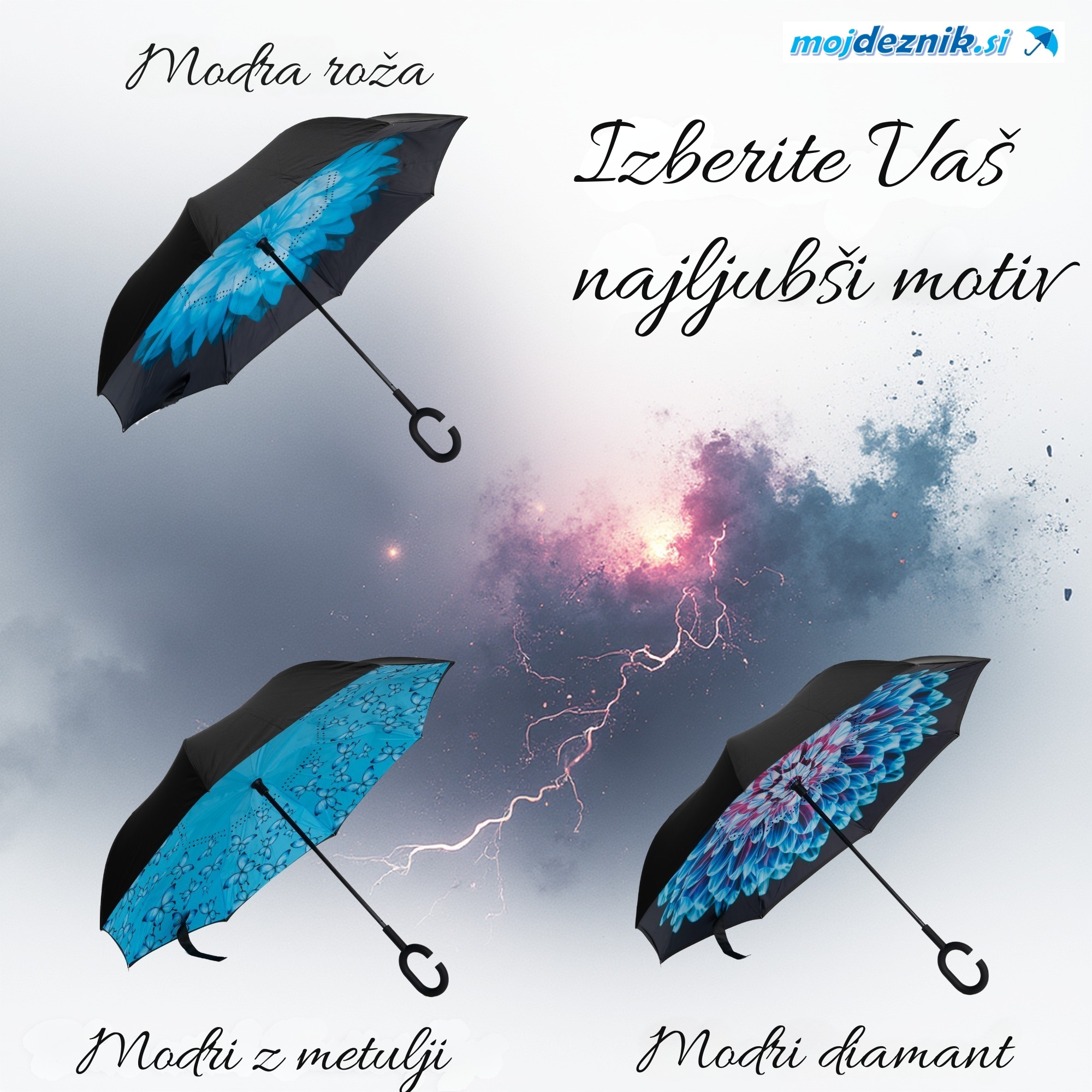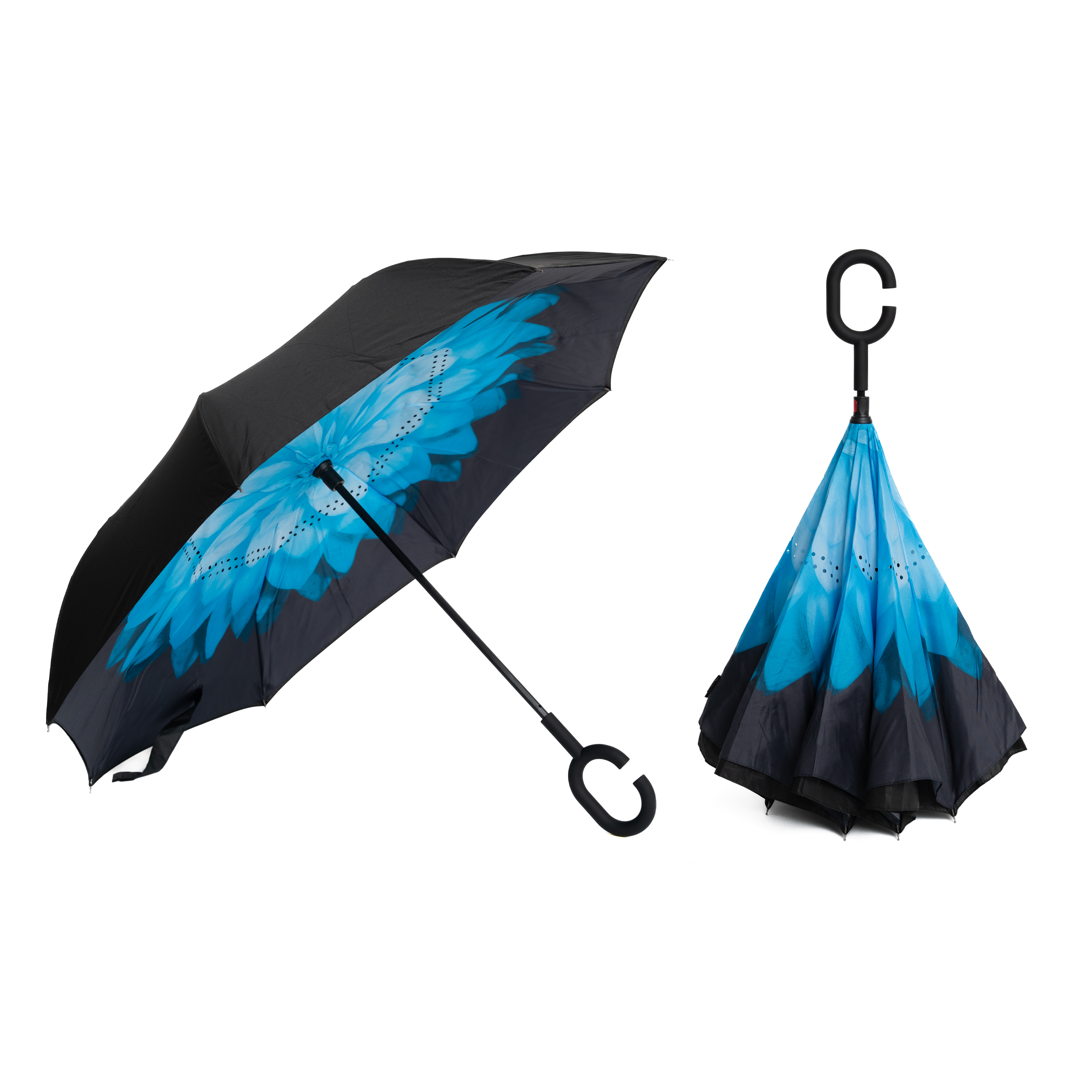 Obratni dežnik popestri deževne dni. Izredno velik spodnji premer, 107 cm poskrbi, da ostanete suhi tudi v močnem dežju. Inovativen gumiran ročaj v obliki črke C, ne drsi in omogoča nošenje odprtega dežnika na roki nad zapestjem. Tako ostaneta roki prosti.