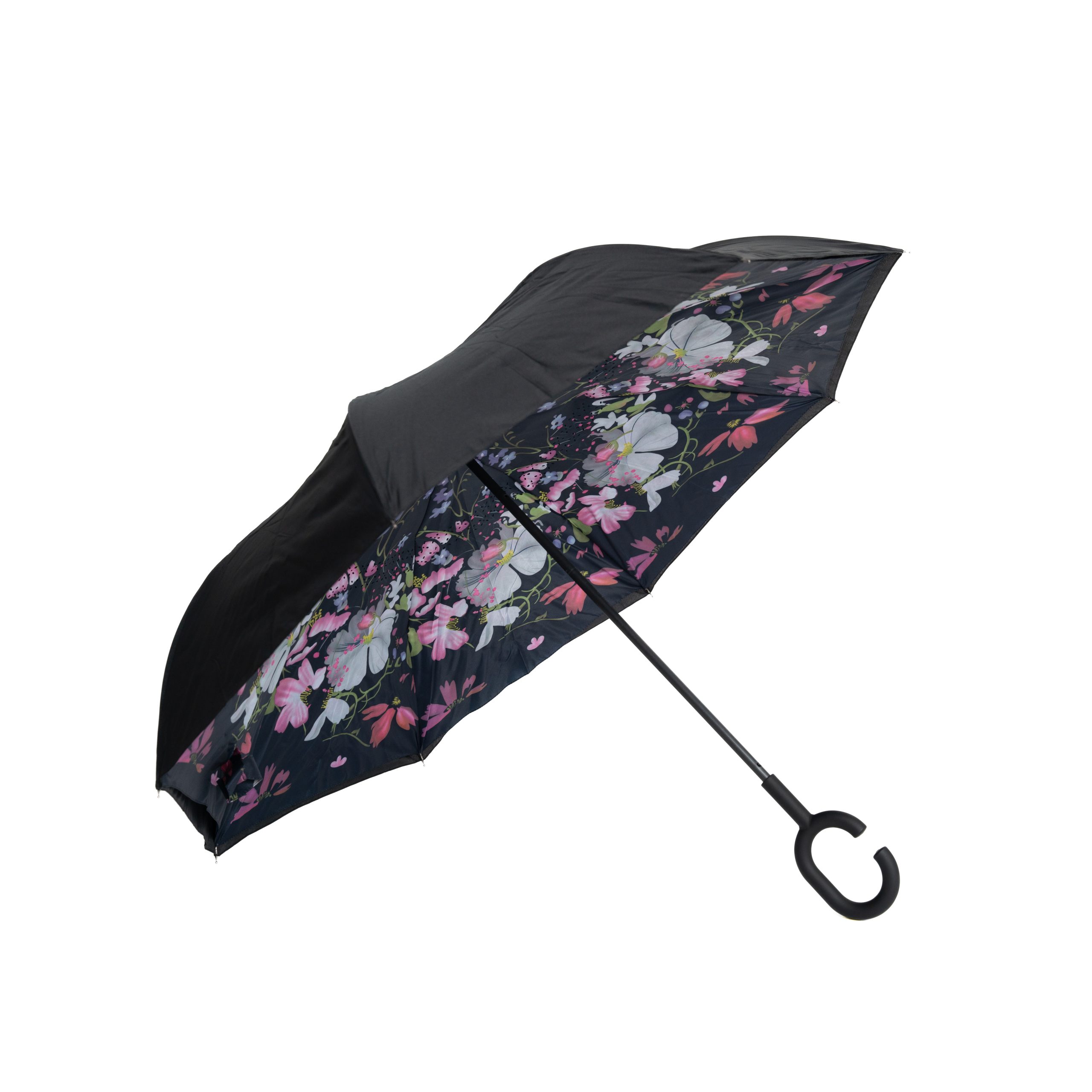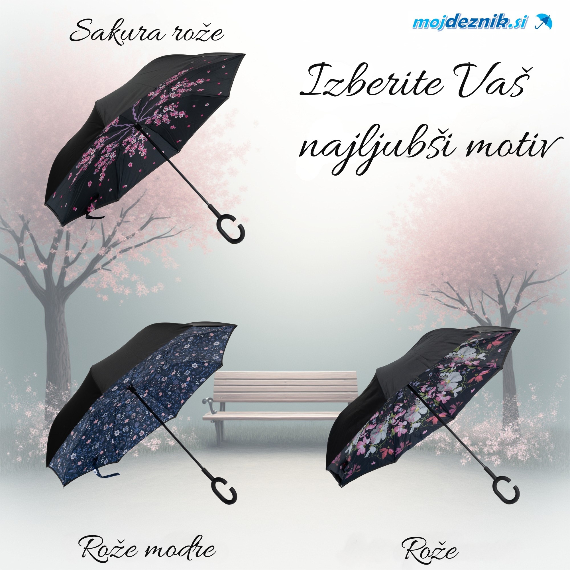 Obratni dežnik popestri deževne dni. Izredno velik spodnji premer, 107 cm poskrbi, da ostanete suhi tudi v močnem dežju. Inovativen gumiran ročaj v obliki črke C, ne drsi in omogoča nošenje odprtega dežnika na roki nad zapestjem. Tako ostaneta roki prosti.