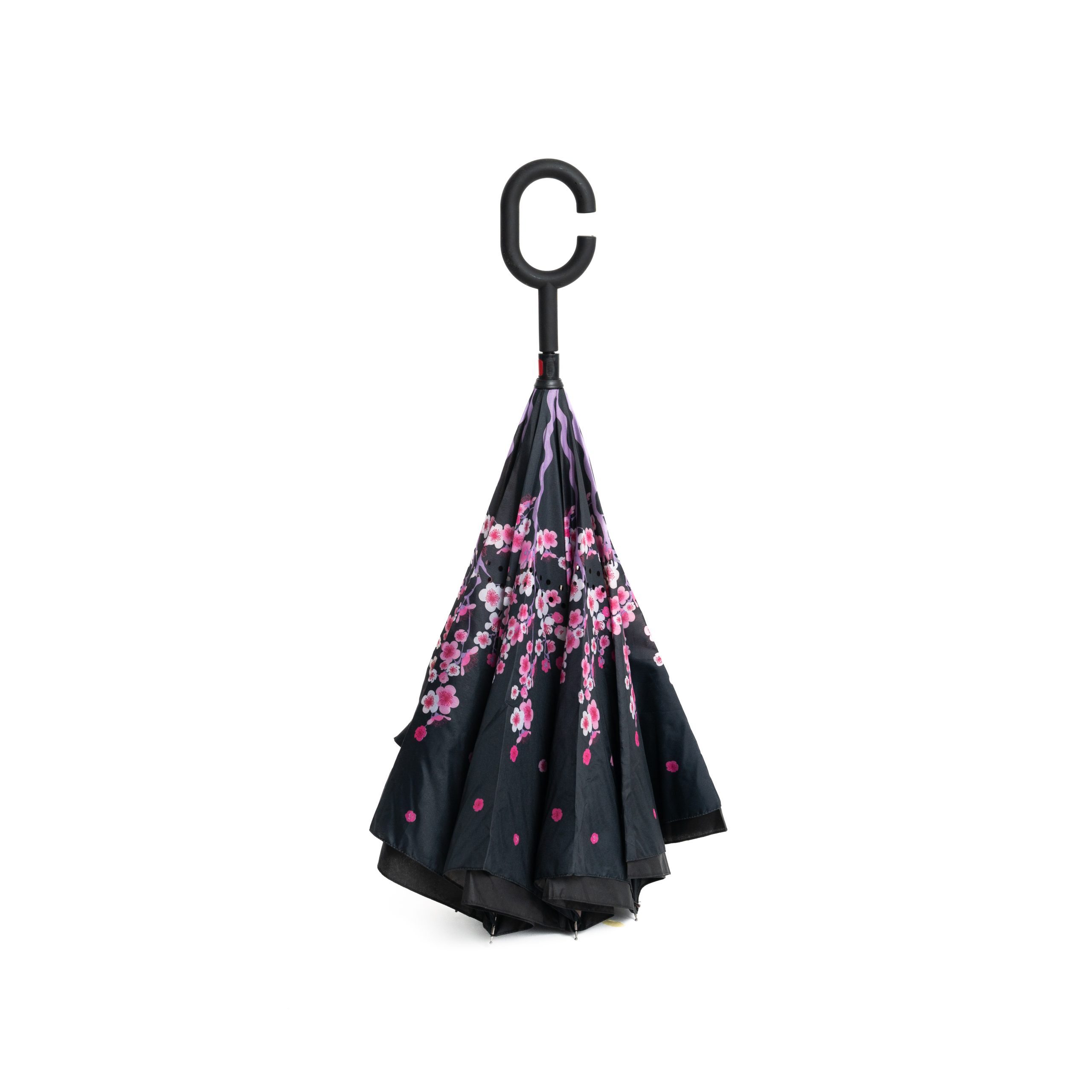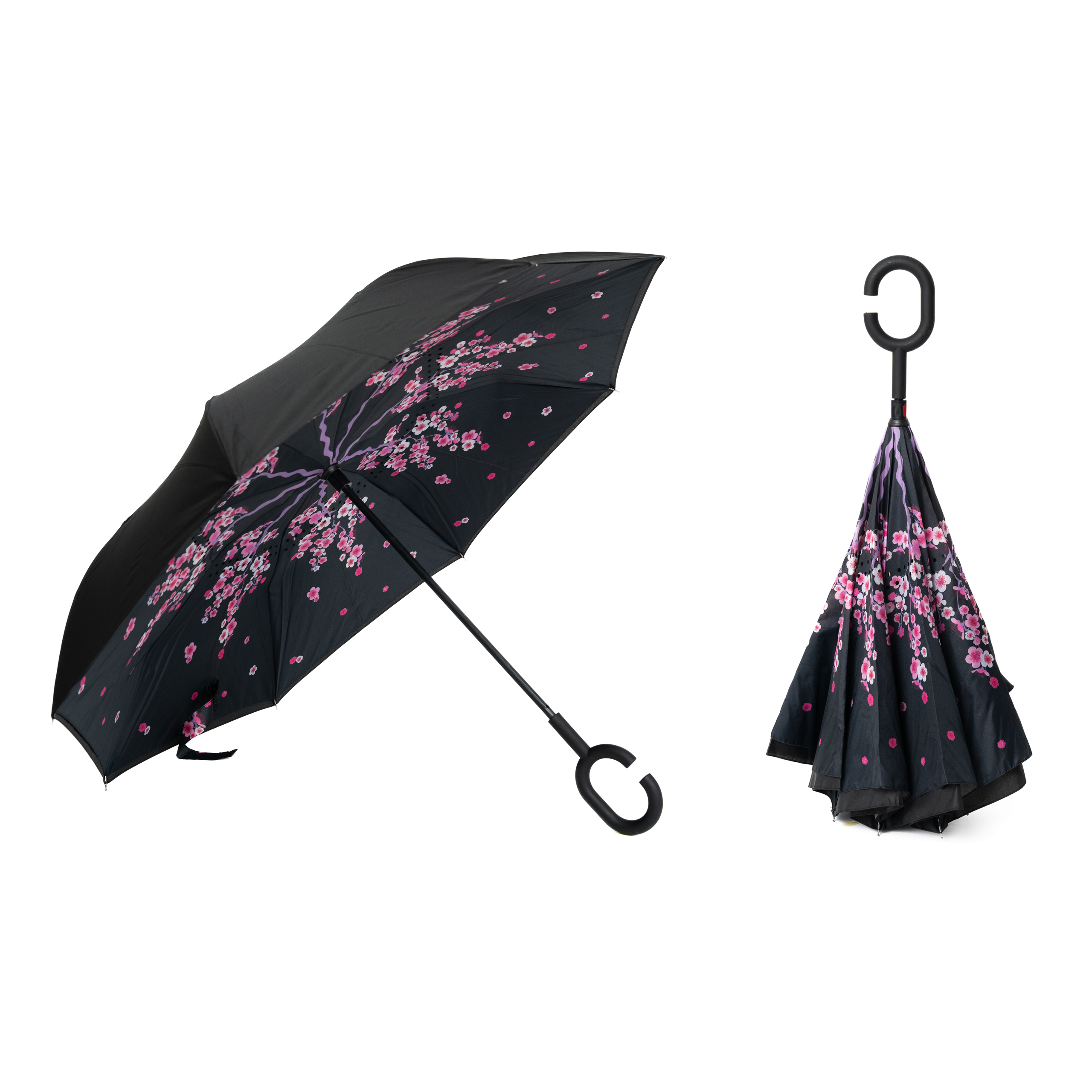 Obratni dežnik popestri deževne dni. Izredno velik spodnji premer, 107 cm poskrbi, da ostanete suhi tudi v močnem dežju. Inovativen gumiran ročaj v obliki črke C, ne drsi in omogoča nošenje odprtega dežnika na roki nad zapestjem. Tako ostaneta roki prosti.