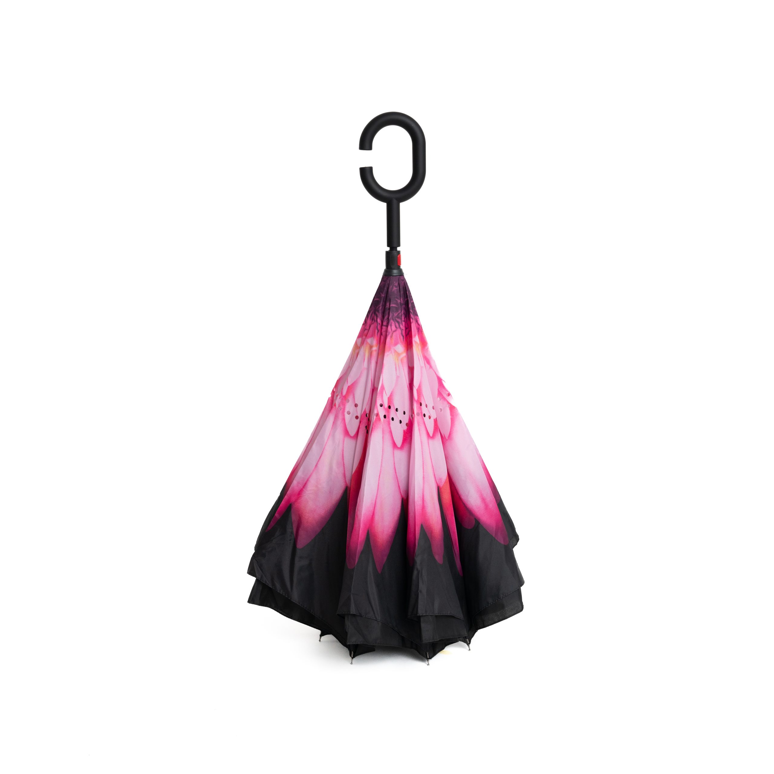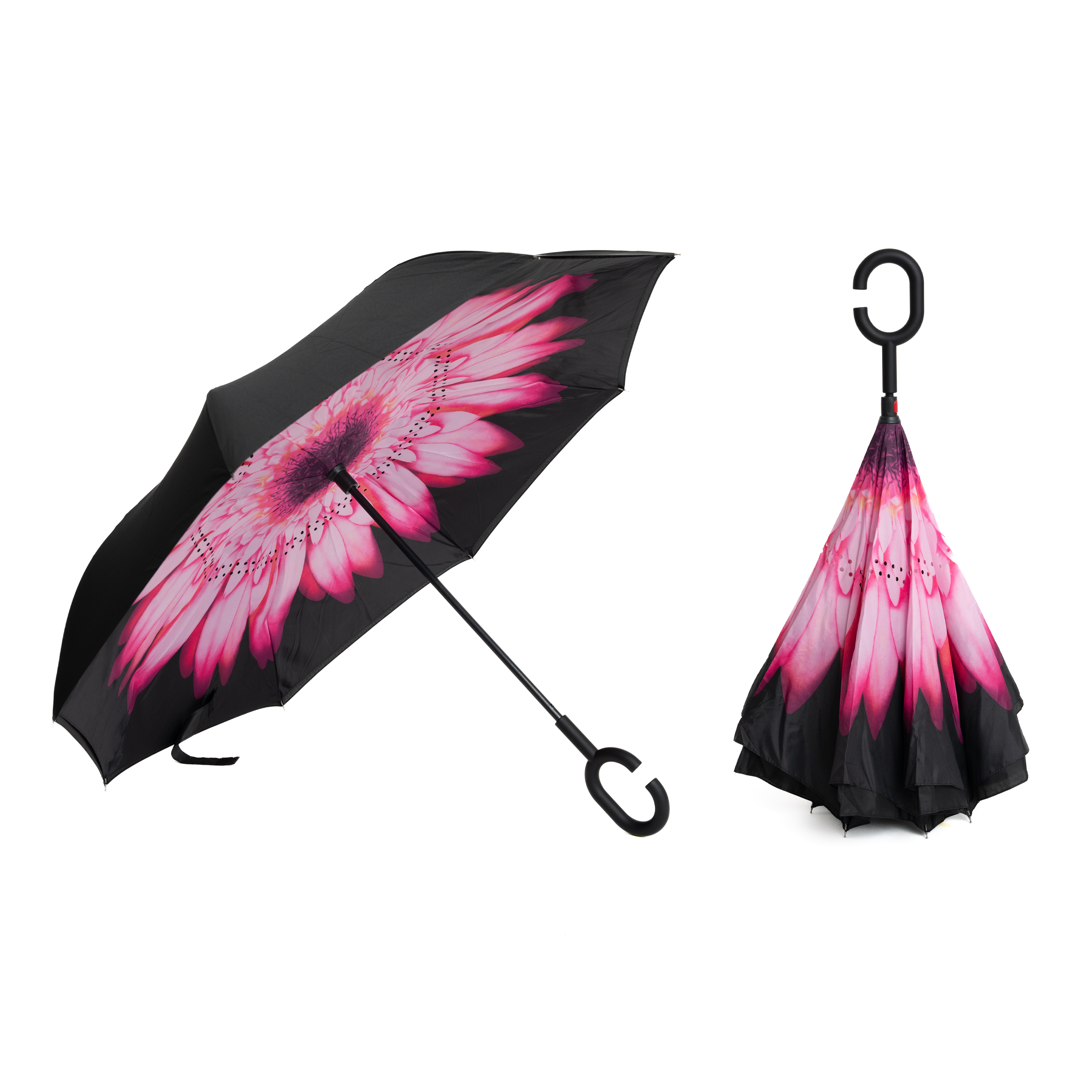 Obratni dežnik popestri deževne dni. Izredno velik spodnji premer, 107 cm poskrbi, da ostanete suhi tudi v močnem dežju. Inovativen gumiran ročaj v obliki črke C, ne drsi in omogoča nošenje odprtega dežnika na roki nad zapestjem. Tako ostaneta roki prosti.